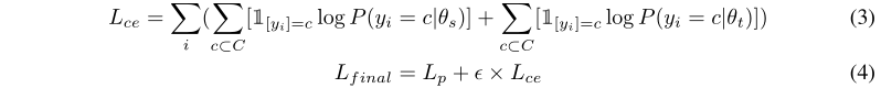 我们最后的损失函数除了可选的投影损失外,还包括对学生和教师模型进行交叉熵修正的掩码语言损失,因为教师模型是用双词汇输入训练的,不是静态的。P(y_i=c|θs)和P(y_i=c|θt)分别表示c类学生和教师模型预测概率,1表示指标函数。下面的方程3和4定义了最终损失L_final,其中eta是超参数: