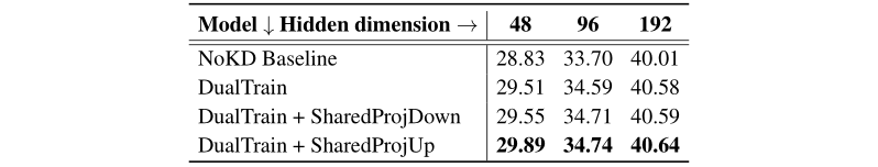 表2包含不同模型的掩码词预测精度和NoKD基线。我们观察到双训练对所有的模型维度都有显著的改善,而双训练所增加的共同投影损失进一步提高了单词预测的准确性。值得注意的是,对于所有的模型维度,投影到教师空间中的SharedProjUp要比SharedProjDown表现得更好,对于48维度来说,这是很明显的。意料之中的是,从192维到96维再到48维的隐藏状态模型,性能有了明显的下降。