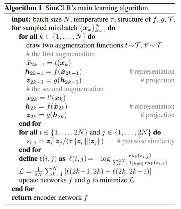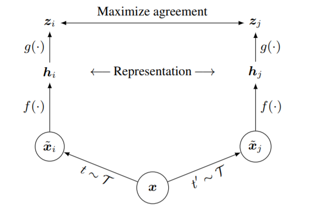 图2: 视觉表示对比学习的简单框架。从相同的增广族系(t∼T 和t′∼T) 中采样两个独立的数据增广操作符,并应用于每个数据示例,以获得两个相关的视图。基础网络编码器f(⋅)和投影头g(⋅)训练协议使用对比损失最大化。训练完成后,我们通过投影头g(⋅)和使用编码器h f(⋅)和表示下游任务。
