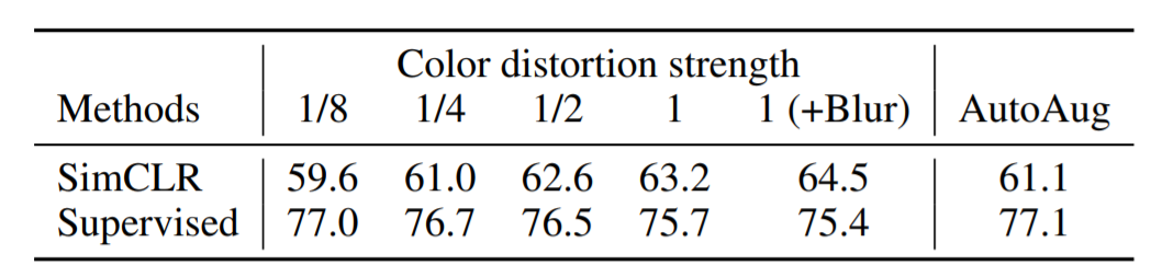 数据增强操作的组合对于学习好的表示非常重要,对比学习需要比监督学习更强的数据增强能力。