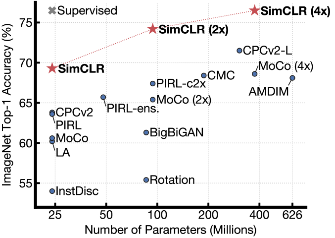 图1: ImageNet top-1在不同自监督方法学习的表示上训练的线性分类器的精度(在ImageNet上预先训练)。灰色十字表示有监督的ResNet-50。我们的方法SimCLR以粗体显示。
