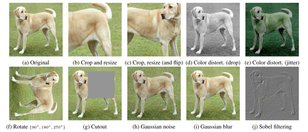 图4: 所研究的数据增强操作的示意图。每个增量都可以随机地利用一些内部参数(如旋转度、噪声水平)对数据进行转换。请注意,我们只在消融中测试这些操作符,用于训练我们的模型的增强策略只包括随机裁剪(通过翻转和调整大小)、颜色失真和高斯模糊