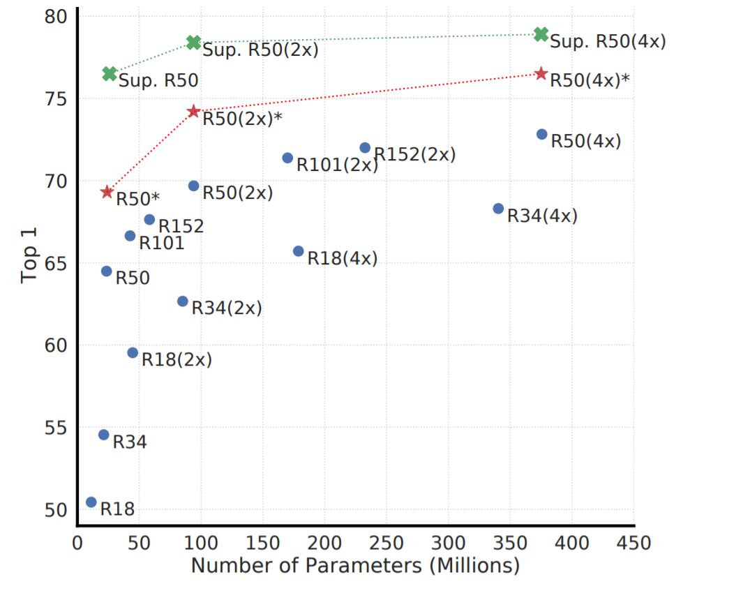 图7: 不同深度和宽度模型的线性评估。蓝点上的模型我们训练了100个epochs,红星上的模型我们训练了1000个epochs,绿十字上的模型我们训练了90个epochs