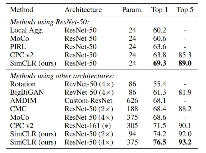 在这项工作中,我们介绍了视觉表示对比学习的一个简单框架,我们称之为SimCLR。SimCLR不仅优于以前的工作(图1),而且更简单,不需要专门的架构(Bachman et al., 2019; Hénaff et al., 2019)或者存储池 (Wu et al., 2018; Tian et al., 2019; He et al., 2019a; Misra & van der Maaten, 2019)。