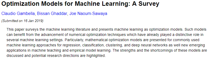 【导读】创造智能机器的追求至少可以追溯到20世纪50年代后期数字计算发展的早期阶段。目标是通过学习过去的经验,然后在与过去观察不同的条件下解决复杂问题,使机器能够执行认知功能。在计算能力和数据的指数增长以及广泛的实际应用的推动下,机器学习如今已成为具有战略意义的领域。从广义上讲,机器学习依赖于学习一个模型,该模型在给定特定输入的情况下返回正确的输出。输入,通常是表示定义问题的参数的数值,而输出即响应是表示解的数值。机器学习模型分为两类:监督学习和无监督学习。在监督学习中,响应预测依赖对每个输入的观察,目的是拟合准确预测未来观测响应的模型。另一方面,在无监督学习中,并没有标注好的响应,学习的目标是理解观察的基本特征。这些学习模型的基本理论及其成功在很大程度上归功于计算机科学,统计学和运筹学界面的研究。机器学习和运筹学之间的关系可以从三个方面来看:(a)应用于管理科学问题的机器学习,(b)解决优化问题的机器学习,(c)作为优化问题制定的机器学习问题。 文章探讨各个机器学习模型与的优化方法的关系,将机器学习模型按照优化问题建模,从而将机器学习问题的解决转化为解决优化问题。