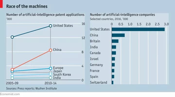 《经济学人》刊载的2005、2010年相关国家AI专利申请数量,以及2016年相关国家AI公司数量。