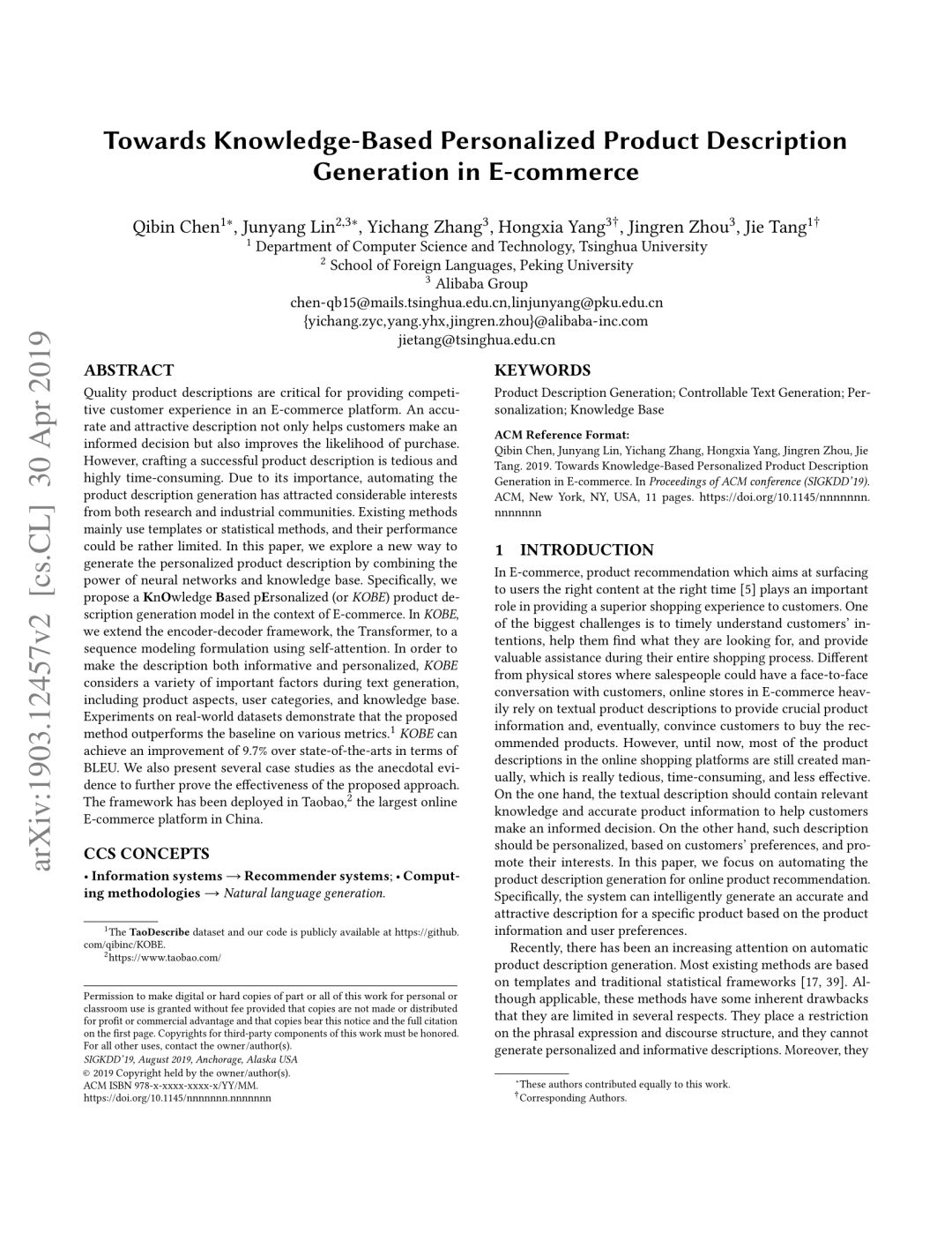 论文链接: https://arxiv.org/pdf/1903.12457.pdf 论文题目: Towards Knowledge-Based Personalized Product Description Generation in E-commerce