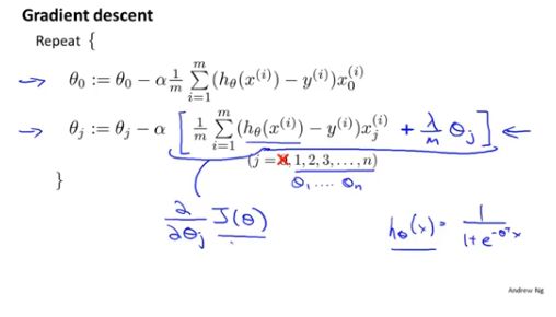 如前面所述,i从1(这里是j)开始,所以将j=0的情况单独拿出来。对于j=1之后的参数的更新,增加一项,经过整理后可得下图最下方的式子。这里