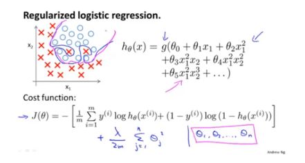 前面的总结内容中我们同样介绍过logistic的代价函数,正则化后,需要在代价函数后面加上一项,这样原先过拟合的边界(如下坐标图上的蓝色线)就会变成更加合理的边界线(如下图粉色的线)。