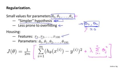 如下图,例如前面提到的房价问题,假设影响房价的特征有一百个,为了使参数尽可能小,在代价函数里增加,注意这里i从1开始(在后面的总结中会再次提到)