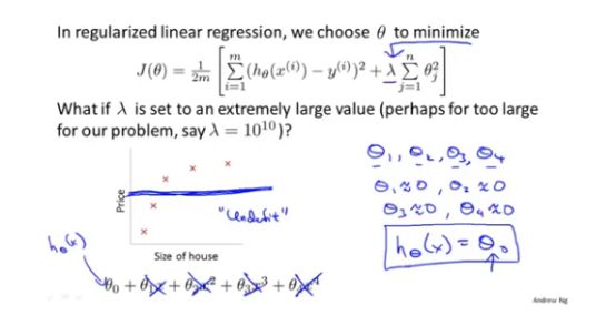 上面的总结中提到了正则化(涉及参数),那么当过大时,则会导致除外的其余参数都近似为0,这样预测函数近似变为图中的一条水平线,可以很明显的看出这样的拟合效果是极差的。