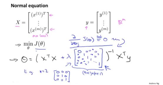 对于求解线性回归问题的最优化,可以使用常规方程法。对于正则化之后,只需要在求逆之前,对加上一项(其中对角线上第一个元素是0,其余位置是1,对角线以外都是0)