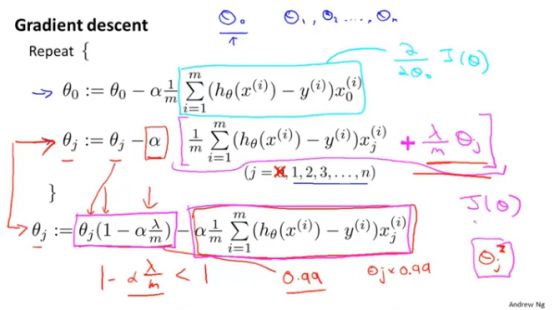会是一个略小于1的数(比如0.99之类)。其余部分与未正则化的线性回归的梯度下降公式一样。总而言之:对于