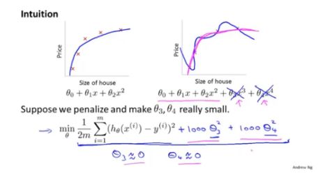 如下右半图,当我们用四次多项式去拟合数据的时候,会出现过拟合的现象。现在想到的策略是给代价函数加上惩罚项(1000+1000),目的是为了让,最小。(如下图,为了使代价函数最小,则需要使与尽量小,近似为0,则四次多项式近似退化为二次多项式,从而可以对数据进行较好的拟合)