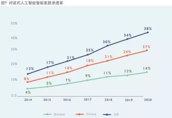 在细分领域内,对话式人工智能已在智能家居、随身设备和智能车载三大领域落地。其中,对话式人工智能在智能家居的带动下,有望发生革命性的变化。从全球发展状况来看,目前美国在对话式人工智能市场处于领先地位,中国随着各大科技巨头的入局以及DuerOS等开放平台的推动,也在奋起直追。预计中国2020年对话式人工智能智能家居的渗透率将达到27%,这一数字虽然低于美国的38%,但却遥遥领先全球平均水平(14%)。