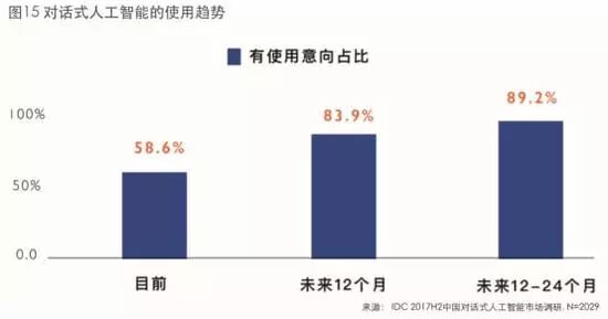 从用户的新产品的采用态度、采用原因等方面给出的反馈来看,用户体检的不断提升正在促进对话式人工智能向前高速发展。在《白皮书》中,IDC公布了他们的调研数据:未来12-24个月,有意向使用对话式人工智能的终端用户将达到89%。因此,IDC认为,在未来,终端用户将大规模的使用对话式人工智能。