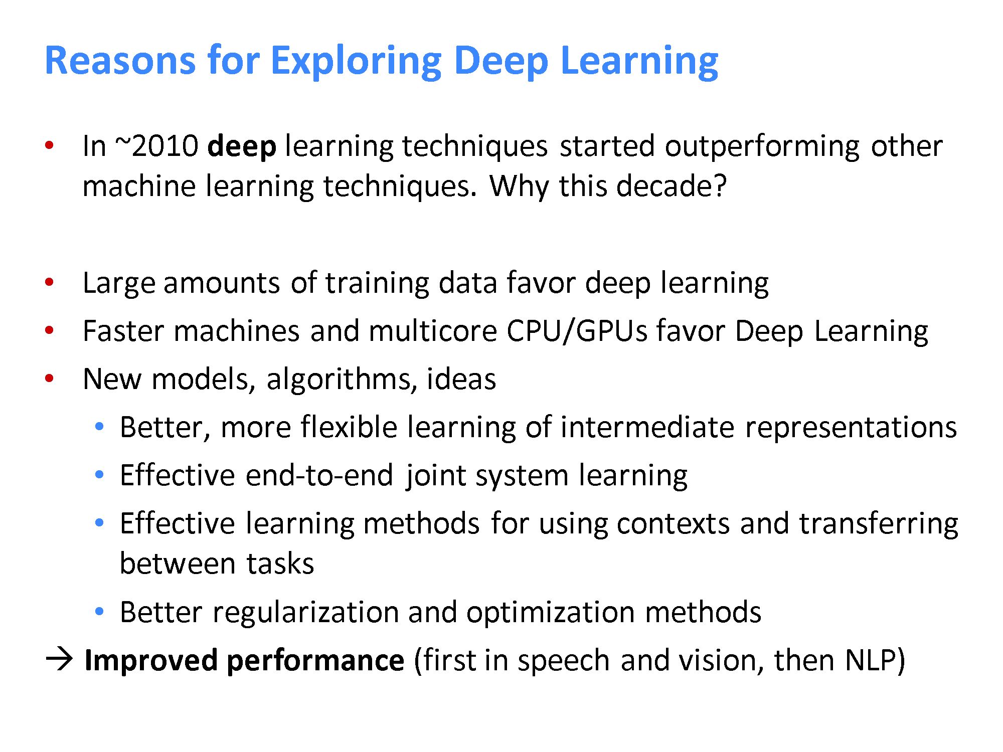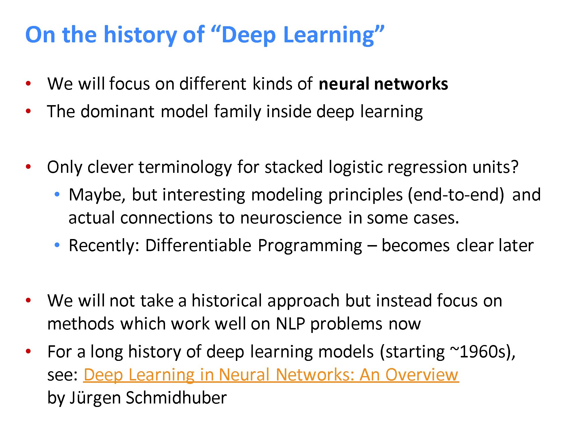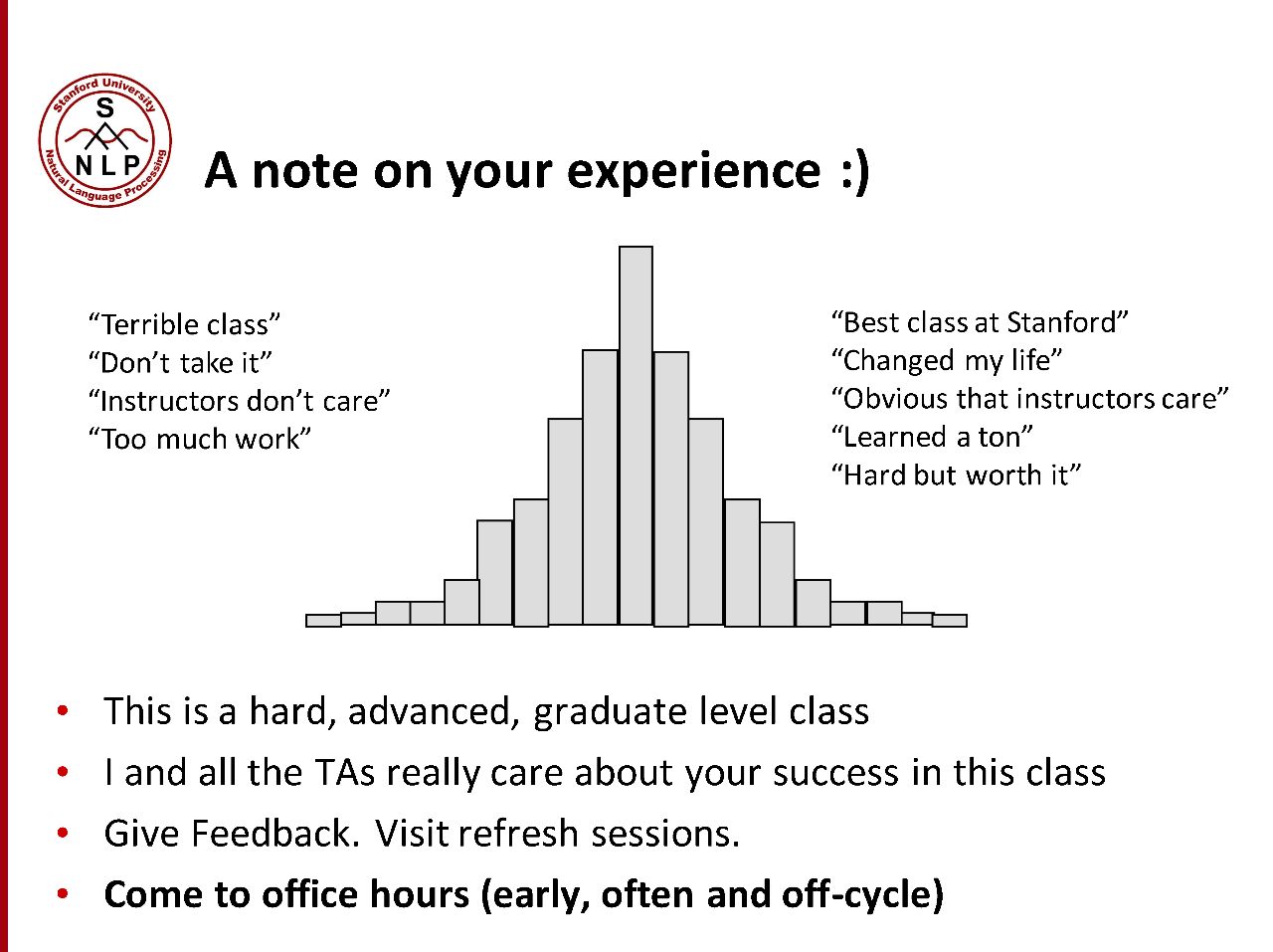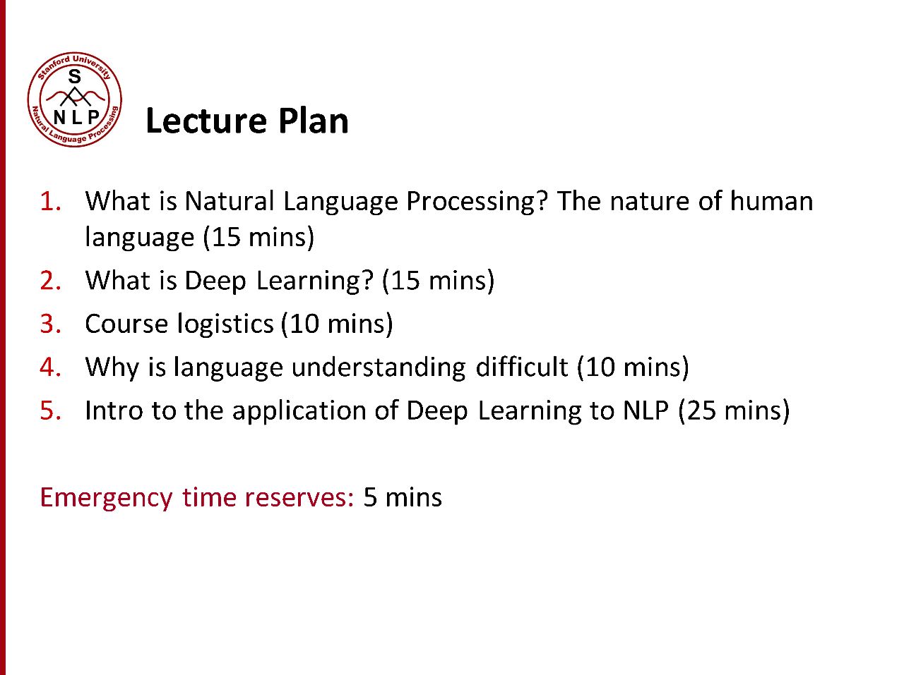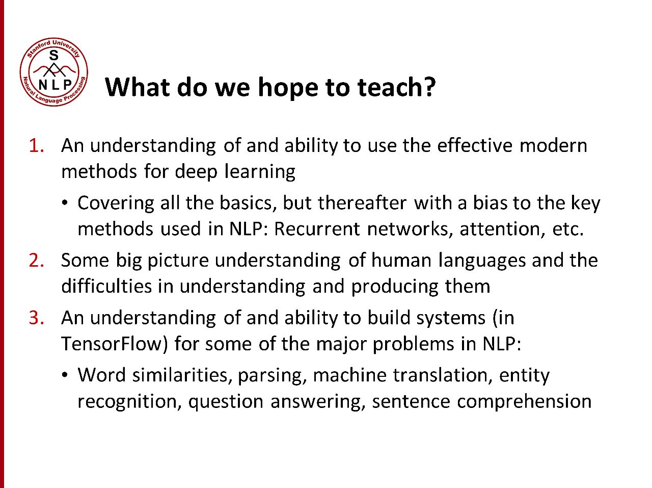 自然语言处理(NLP)是信息时代最重要的技术之一,理解复杂的人类话语也是人工智能的重要任务。NLP的应用无处不在,因为人们的日常生活大部分都需要语言交流,例如网页搜索、广告、电子邮件、客户服务、语言翻译,电台广播等。为NLP的应用赋能的有大量广泛的底层任务和机器学习模型。最近,深度学习的方法在许多NLP任务中获得了非常好的性能。这些模型通常可以通过单个端到端的模型进行训练,并且不需要传统的任务特定的特征工程。在今年春季的NLP课程中,我们将学习实现,训练,调试,可视化和创建自己的神经网络模型。这门课程为深入学习NLP应用的前沿研究提供了深入的探索。课程最后的项目将涉及训练复杂的循环神经网络并将其应用于大型NLP问题。在模型方面,我们将涵盖词向量表示,基于窗口的神经网络,循环神经网络,长短期记忆模型,递归神经网络,卷积神经网络以及一些涉及 memory component 的非常新的模型。通过讲座和编程任务,学生将学会令神经网络在实际问题上工作的必要工程技巧。