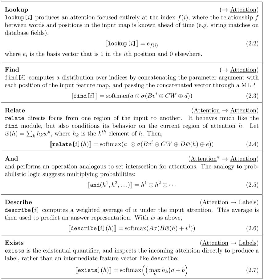 在解决实际问题时,首先对问题进行分解,然后再动态选择子模块解决问题。如左侧问题: 图片中的鸟是什么颜色? 首先调用Find模块,通过注意力机制,找到图中的鸟的位置,然后然后调用describe模块,对鸟的颜色进行描述。右侧问题:知识库中是否存在任何州?同样也是先调用Find模块,高亮出Georgia州,然后调用存在模块,判断是否是州。