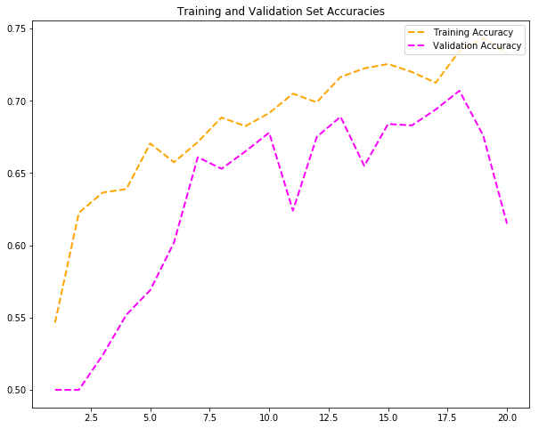我获得了69%的训练准确率和65%的验证准确度。 第一次尝试还不错! 让我们看看当我将epoch加倍并添加卷积,批量标准化,汇集和丢失层的另一个组合时会发生什么。