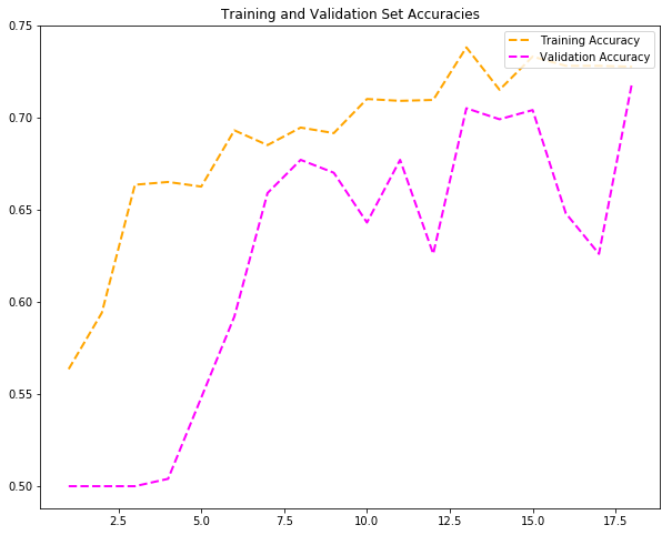 经过多次训练,这个相当小的数据集的理想epoch设置为18。 在不改变损耗和优化器参数的情况下,我能够获得72%的验证准确度。