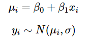 总结如下:因变量Y服从正态分布,其参数为均值μi,精度参数τ。μi为X参数的线性函数,由β0和β1进行参数化。