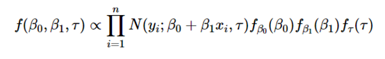 似然函数与上面的相同,不同的是假设参数β0,β1,τ的先验分布,并将它们包含在方程中: