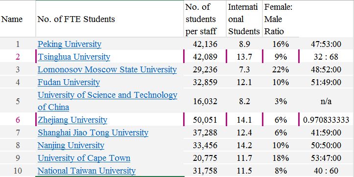 排行榜囊括42个新兴经济体国家和地区的378所高校。排名前十的大学中有7所来自中国大陆,除北大、清华外,排名第八的南京大学首次跻身前十,另外4所是复旦大学、中国科学技术大学、浙江大学和上海交通大学。台湾大学排名第十。