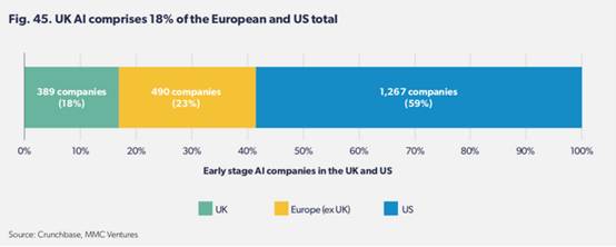 英国人工智能公司占欧洲总市场的近一半。人工智能在英国的表现很好,在人工智能方面的创业公司比例略高于欧洲(不包括英国)或美国。