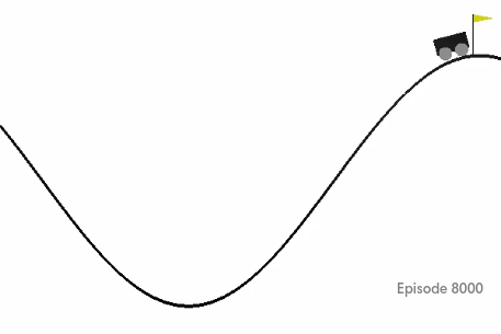 gym库的在设计环境以及个体的交互时基本上也是解决上述问题,但是它有它的规范和接口。gym库的核心在文件core.py里,这里定义了两个最基本的类Env和Space。前者是所有环境类的基类,后者是所有空间类的基类。从Space基类衍生出几个常用的空间类,其中最主要的是Discrete类和Box类。通过其__init__方法的参数以及其它方法的实现可以看出前者对应于一维离散空间,后者对应于多维连续空间。它们既可以应用在行为空间中,也可以用来描述状态空间,具体怎么用看问题本身。例如如果我要描述上篇提到的一个4*4的格子世界,其一共有16个状态,每一个状态只需要用一个数字来描述,这样我可以把这个问题的状态空间用Discrete(16)对象来描述就可以了。对于另外一个经典的小车爬山的问题(如下图),小车的状态是用两个变量来描述的,一个是小车对应目标旗杆的水平距离,另一个是小车的速度(是沿坡度切线方向的速率还是速度在水平方向的分量这个没仔细研究),因此环境要描述小车的状态需要2个连续的变量。由于描述小车的状态数据对个体完全可见,因此小车的状态空间即是小车的观测空间,此时再用Discrete来描述就不行了,要用Box类,Box空间可以定义多维空间,每一个维度可以用一个最低值和最大值来约束。同时小车作为个体可以执行的行为只有3个:左侧加速、不加速、右侧加速。因此行为空间可以用Discrete来描述。最终,该环境类的观测空间和行为空间描述如下: