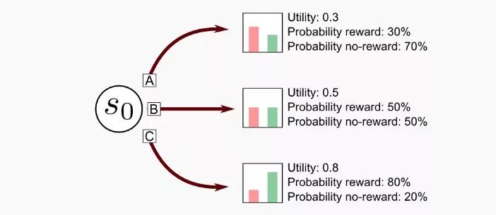 实验部分我们以N=3为例,并且设定老虎机的回报满足伯努利分布【3】,即回报结果为0/1. 在初始状态S0时,三个摇臂(A、B、C)每次回报为1的概率分别是30%, 50%和80%.