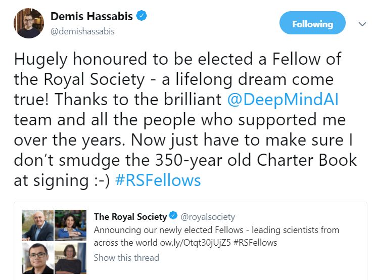 Demis Hassabis 当选英国皇家学会院士