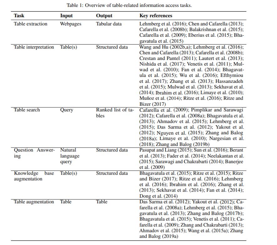 表是组织和操作数据的强大而流行的工具。在网上可以找到大量的表格,这是一种宝贵的知识资源。这项调查的目的是综合和介绍二十年来对web表的研究。特别地,我们将现有的文献组织成六类主要的信息访问任务:表提取、表解释、表搜索、问题回答、知识库扩展和表扩展。对于这些任务中的每一个,我们将识别和描述重要的方法,提供相关的资源,并指出不同任务之间的相互依赖性。