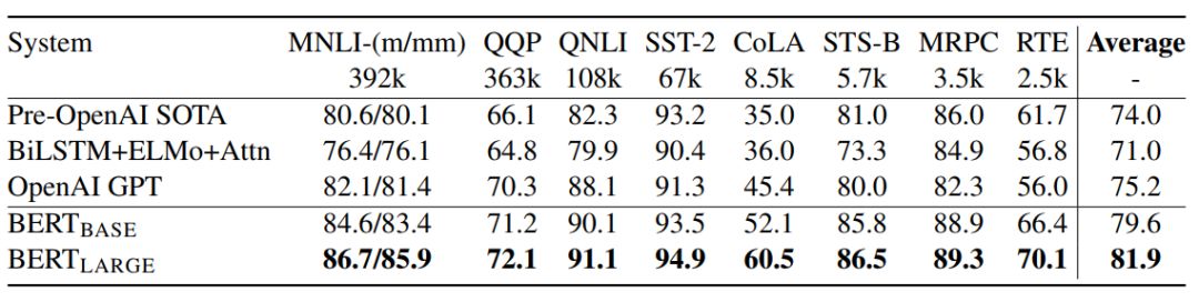 表 1:GLUE 测试结果,评分由 GLUE 评估服务器得到。每个任务下面的数字表示训练样本的数量。「Average」列与 GLUE 官方分数略微不同,因为我们排除了有问题的 WNLI 集。OpenAI GPT = (L=12, H=768, A=12);BERT_BASE = (L=12, H=768, A=12);BERT_LARGE = (L=24, H=1024, A=16)。BERT 和 OpenAI GPT 是单个模型、单个任务。所有结果来自于以下地址:https://gluebenchmark.com/leaderboard 和 https://blog.openai. com/language-unsupervised/。