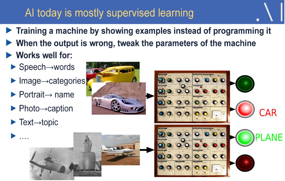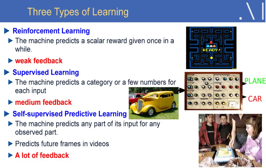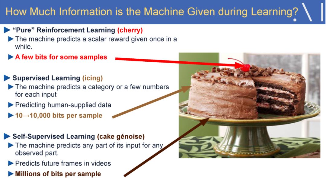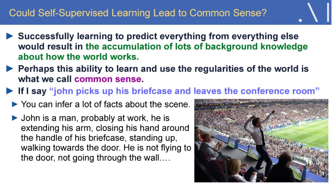 LeCun 表示人工智能革命的未来不会是有监督学习,也不会是单纯的强化学习,而是需要学习一个具备常识推理与预测能力的世界模型。LeCun 认为自监督学习是实现这一目标的一个潜在研究方向。他认可现有的有监督学习和强化学习技术可以使人类在自动驾驶、医疗诊断、机器翻译、客服机器人、信息检索等领域中取得不错的进展,但他认为仅仅依靠现有技术,无法实现常识推理、智能个人助理、智能聊天机器人、家庭机器人以及通用人工智能。
