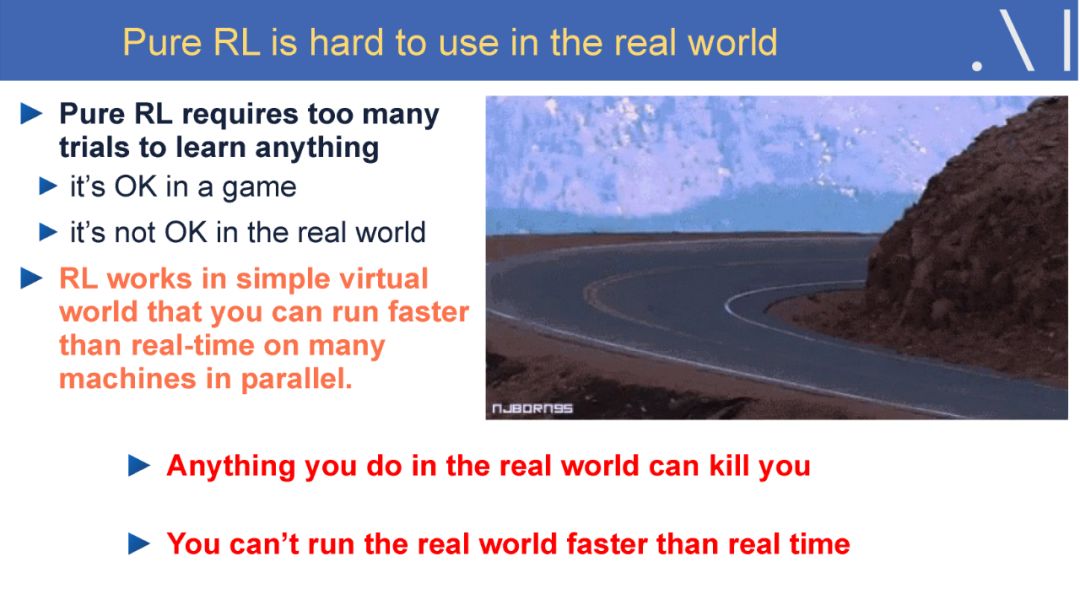 Yan Lecun在报告中指出自监督学习(Self-supervised learning)可以作为强化学习的一种潜在解决方案,因为自监督学习将输入和输出都当成完整系统的一部分,使得它在诸如图像补全,图像迁移,时间序列预测等任务上都非常有效。此外自监督模型的复杂度随着额外反馈信息的加入而增加,可以在很大程度上减少计算过程中人为的干预。