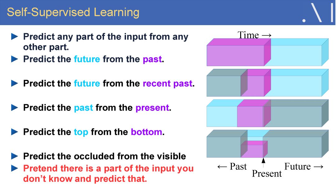 在这样的背景下,LeCun 认为自监督学习是有望突破有监督学习与强化学习现状、学习世界模型的一个潜在研究方向。自监督学习将输入和输出当成一个完整的整体,它通过挖掘输入数据本身提供的弱标注信息,基于输入数据的某些部分预测其它部分。在达到预测目标的过程中,模型可以学习到数据本身的语义特征表示,这些特征表示可以进一步被用于其他任务当中。当前自监督学习的发展主要体现在视频、图像处理领域。例如,在空间层面上包括图像补全、图像语义分割、灰度图像着色等,在时间层面上包括视频帧预测、自动驾驶等。