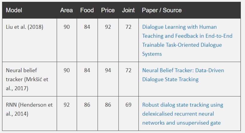 对于目标导向的对话,第二对话状态追踪挑战赛(Second dialog state tracking challenge,DSTSC2)的数据集是一个常用的评估数据集。对话状态追踪涉及确定在对话的每个回合用户在当前对话点的目标的完整表征,其包含了一个目标约束、一系列请求机会(requested slot)和用户的对话行为。DSTC2 聚焦于餐厅搜索领域。模型基于单独的和联合的机会追踪的准确率进行评估。