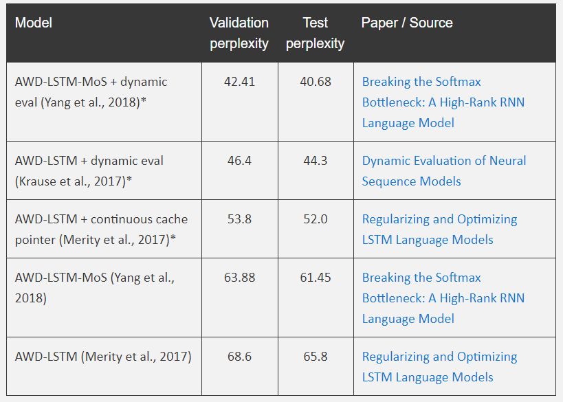 语言建模的常用评估数据集是 Penn Treebank,已经过 Mikolov 等人的预处理(《Recurrent neural network based language model》)。该数据集由 929k 个训练单词、73k 个验证单词和 82k 个测试单词构成。作为预处理的一部分,单词使用小写格式,数字替换成 N,换行符用空格表示,并且所有其它标点都被删除。其词汇是最频繁使用的 10k 个单词,并且剩余的标记用一个标记替代。模型基于困惑度评估,即平均每个单词的对数概率(per-word log-probability),越低越好。