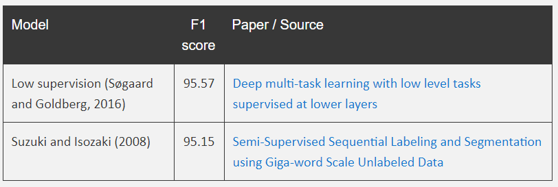 用于词性标注的标准数据集是华尔街日报(WSJ)分配的 Penn Treebank,它包含 45 个不同的词性标签。其中 0-18 用于训练、19-21 用于验证其它 22-24 用于测试。模型一般都通过准确率进行评估。