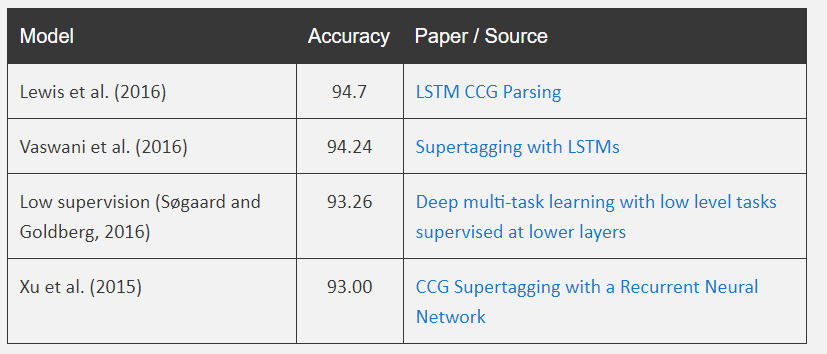 CCGBank 是 CCG 衍生物的语料库,以及从 Hockenmaier 和 Steedman 2007 年提出的 Penn Treebank 中提取的依存结构。第 2-21 部分用于训练,第 00 部分用于开发,第 23 部分用作域内测试集。其性能仅在 425 个最常用的标签上计算。模型基于准确率来评估。