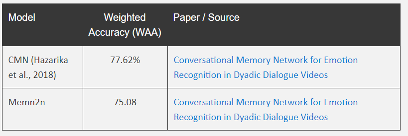 IEMOCAP(Busso等人,2008年)包含了10个说话者的行为,他们的双向对话被分割成话语。所有视频中对话的媒介都是英语。该数据库包含以下分类标签:愤怒、快乐、悲伤、中性、兴奋、沮丧、恐惧、惊讶等等