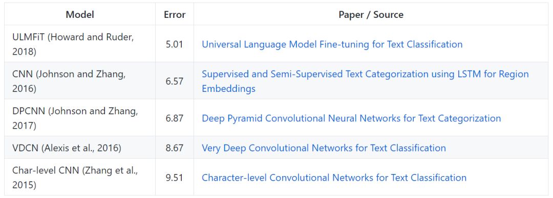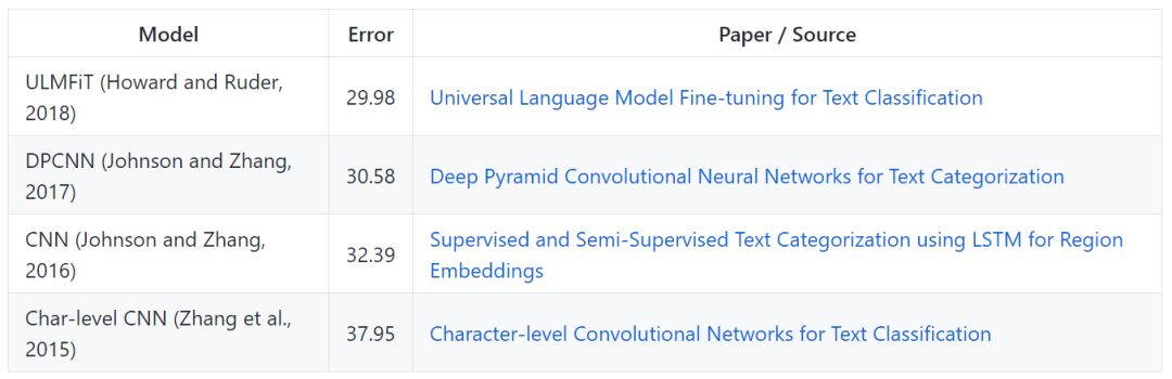 IMDb 是一个包含 50000 条评论的二元情感分析数据集,评论都来自与互联网电影数据库(IMDb),且标注为积极或消极两类。模型同样通过准确率进行评估。