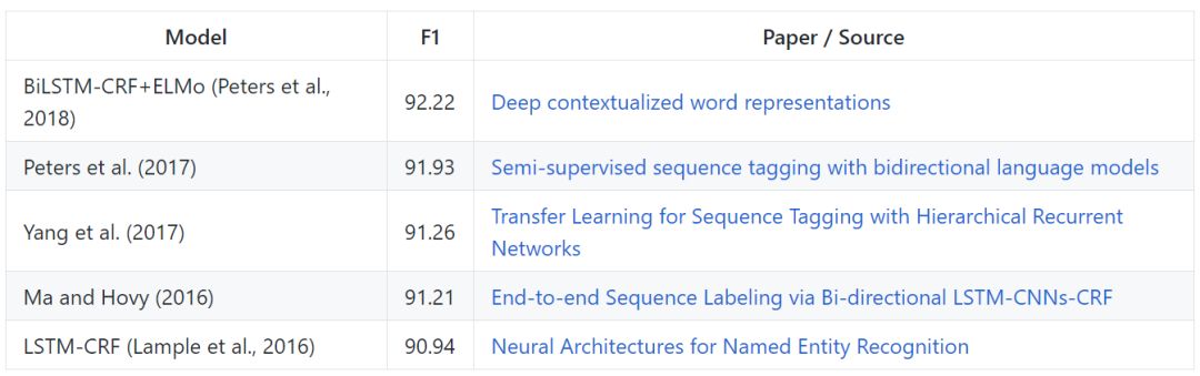 CoNLL 2003 任务包含来自 Reuters RCV1 语料库的新闻通讯文本,以 4 种不同的实体类型进行标注(PER、LOC、ORG、MISC)。模型基于(基于跨度的)F1 评估。