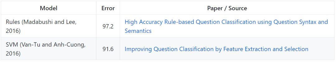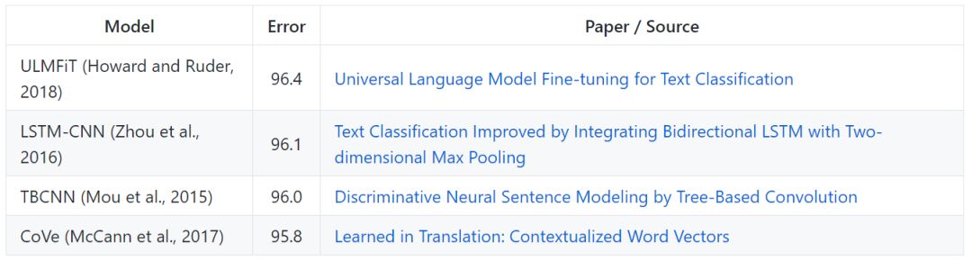 TREC(《The TREC-8 Question Answering Track Evaluation》)是用于问题分类的数据集,包含开放域、基于事实的问题,并被分成广泛的语义类别。它有六类别(TREC-6)和五类别(TREC-50)两个版本。它们都有 4300 个训练样本,但 TREC-50 有更精细的标签。模型基于准确率评估。