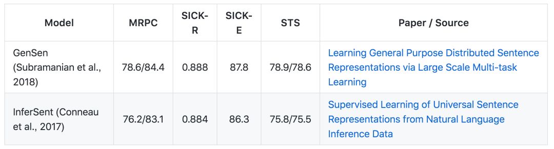 SentEval 是一个用于评估句子表征的工具包,它包含 17 个下游任务,包括一般的语义文本相似性任务。语义文本相似性(STS)从 2012 到 2016(STS12、STS13、STS14、STS15、STS16、STSB)的基准任务基于两个表征之间的余弦相似性度量了两句子之间的相关性。评估标准一般是皮尔森相关性。