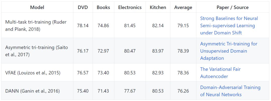 多领域情感数据集(Multi-Domain Sentiment Dataset)是情感分析的领域自适应常用评估数据集。它包含了来自亚马逊的不同产品类别(当成不同领域)的产品评价。这些评价包括星级评定(1 到 5 颗星),通常被转换为二值标签。模型通常在一个和训练时的源域不同的目标域上评估,其仅能访问目标域的未标记样本(无监督域适应)。评估标准是准确率和对每个域取平均的分值。