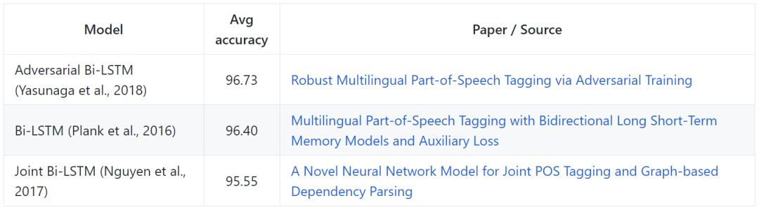Universal Dependencies(UD)是一个跨语言语法标注的框架,它包含超过 60 多种语言的 100 多个 treebanks。模型一般通过 28 种语言中的平均测试准确率进行评估。