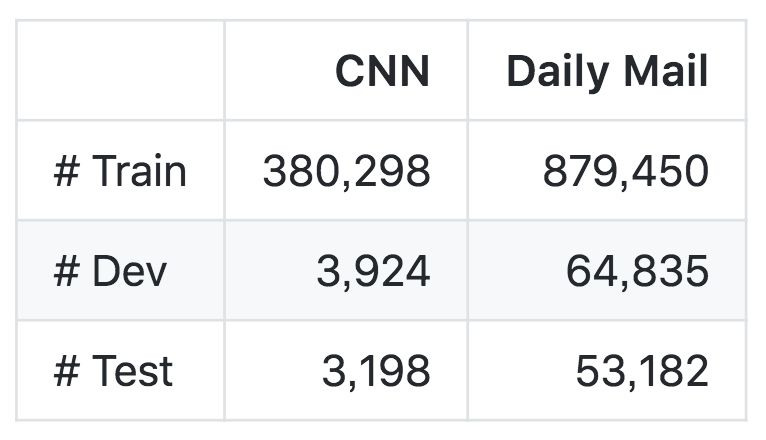 CNN / Daily Mail 数据集是由 Nallapati et al. (2016) 处理并发布,它已经用于评估自动摘要。该数据集包含带有多句摘要(平均 3.75 个句子或 56 个词)的再现新闻文章(平均 781 个词)。经处理的版本包含 287226 个训练对、13368 个验证对和 11490 个测试对。模型基于 ROUGE-1、ROUGE-2 和 ROUGE-L 进行评估,* 表示模型在匿名数据集上进行训练与评估。