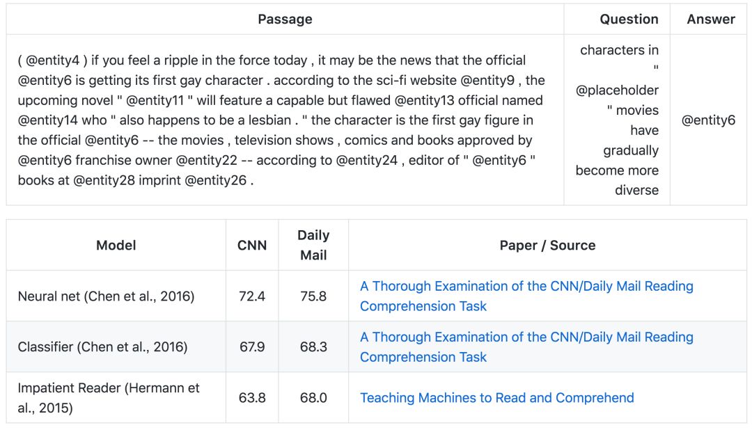 SciTail(《SCITAIL: A Textual Entailment Dataset from Science Question Answering》)导出数据集包含 27k 个条目。和 SNLI、MultiNLI 不同,它不是众包数据集,但是从已有的句子中创建的,假设是从科学问题和对应答案候选中创建的,同时相关网站的来自大型语料库的句子被用作前提。模型基于准确率评估。