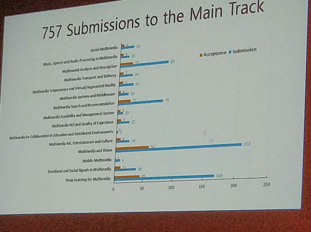 从图中可知,Multimedia and Vision, Deep learning for multimedia 是投稿人数最多的领域。Multimedia Analysis and Description,Multimedia search and Recommend紧随其后。